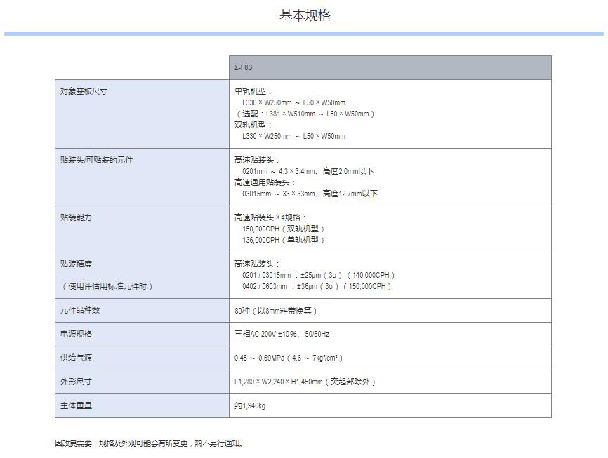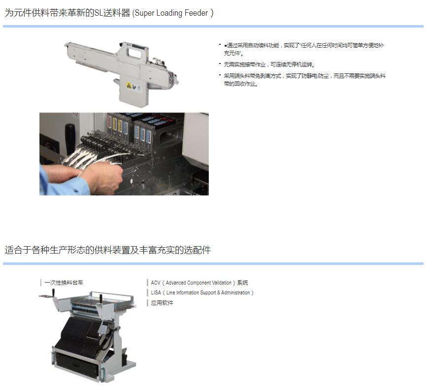 Σ-F8S 高端模塊貼片機1.轉塔式貼裝頭實現(xiàn)1臺貼裝頭支持貼裝多種元件,全面實現(xiàn)快速、通用、高運轉率。2.以4梁、4臺貼裝頭實現(xiàn)同級快速150,000CPH。3.直驅式貼裝頭實現(xiàn)高速、高精度貼裝。4.SL送料器 (Super Loading Feeder) 開拓補料作業(yè)新時代。