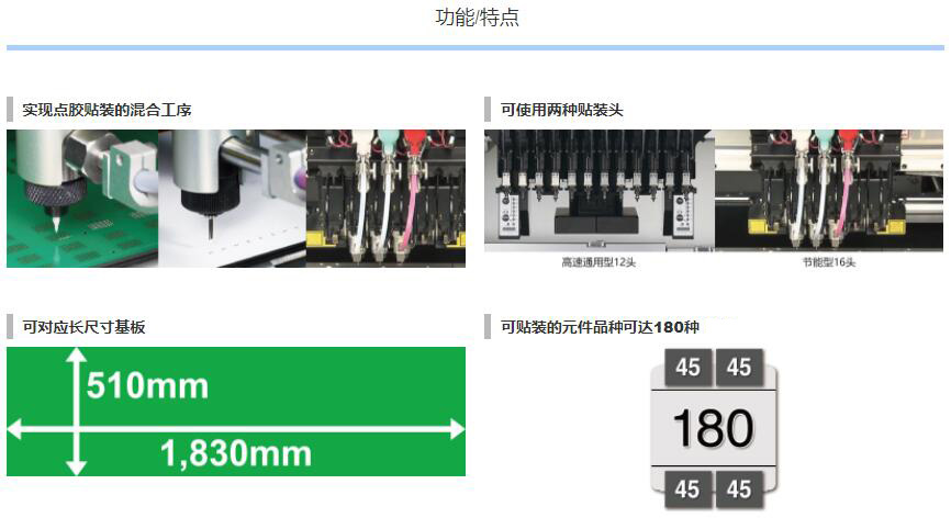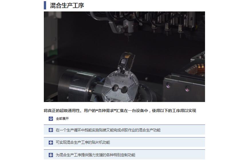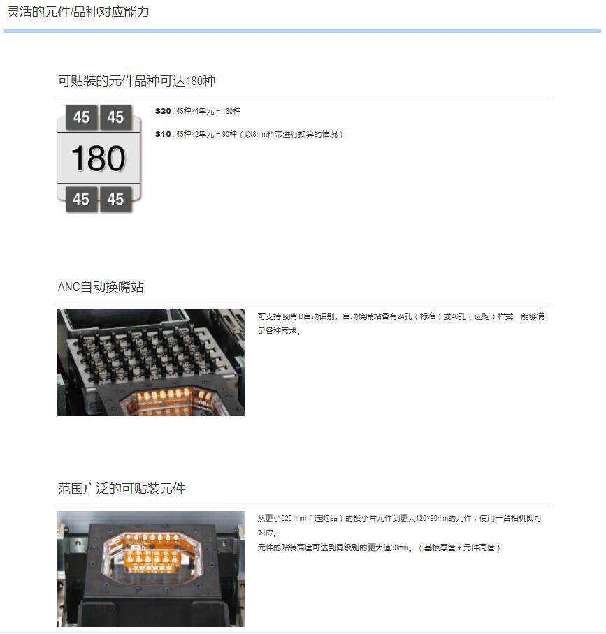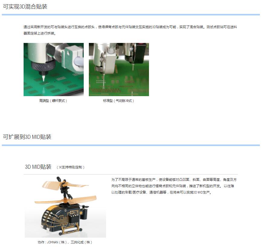 S10/S20 3D混合型模塊貼片機 1.可進行3D MID※貼裝,實現(xiàn)極致的通用性。2.可擴展到貼裝3D MID。3.強化基板應對能力。4.靈活的元件/ 品種應對能力。5.通用性極強的可切換性?!?D MID:三維模塑互連器件=Molded Interconnect Device