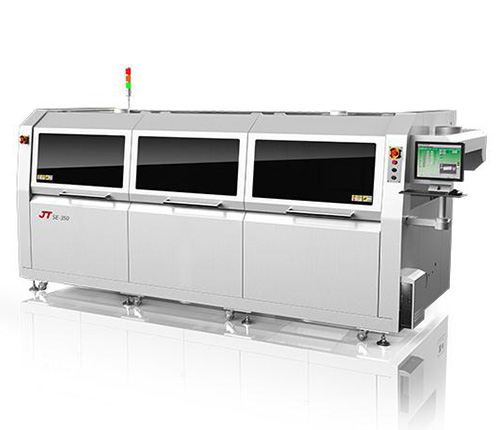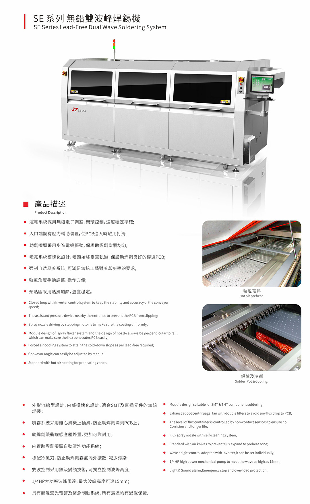 外形流線型設(shè)計(jì),內(nèi)部模塊化設(shè)計(jì),適合SMT及直插元件的無鉛焊接。 噴霧系統(tǒng)采用離心風(fēng)機(jī)上抽風(fēng),防止助焊劑滴到PCB上。 助焊劑緩沖罐感應(yīng)器外置,更加可靠耐用。 標(biāo)配冷風(fēng)刀,防止助焊劑霧氣向外擴(kuò)散,減少污染。 雙波控制采用無極變頻技術(shù),可獨(dú)立控制波峰高度。 1/4HP大功率波峰馬達(dá),更大波峰高度可達(dá)15mm。 具有超溫聲光…