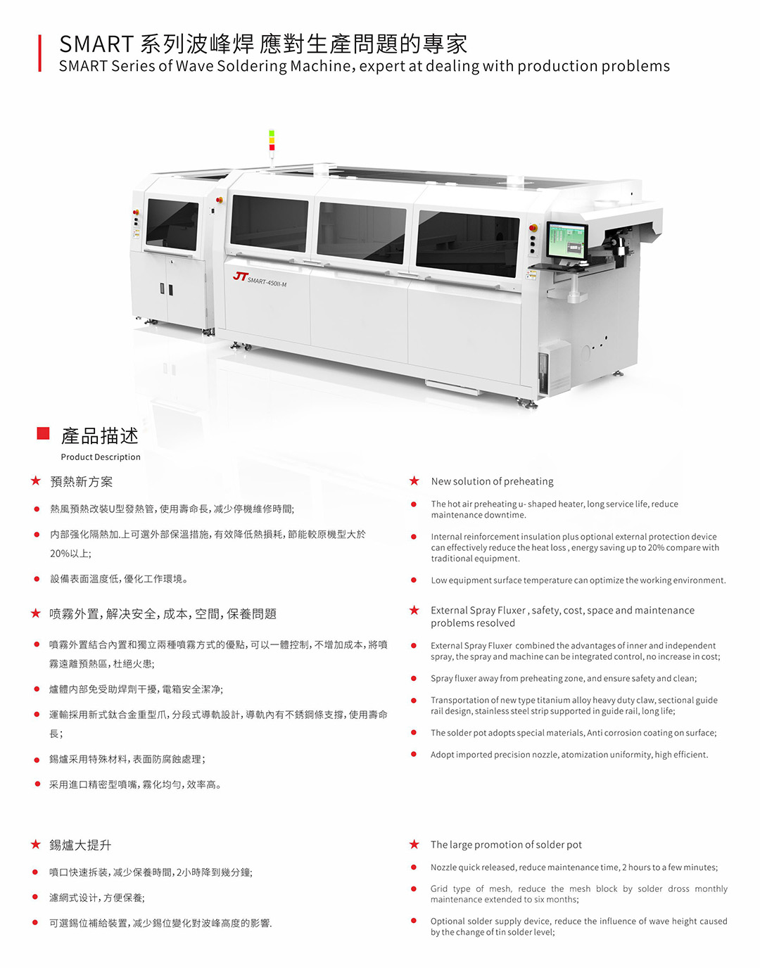 噴霧外置結(jié)合內(nèi)置和獨(dú)立兩種噴霧方式的優(yōu)點(diǎn),可以一體控制將噴霧遠(yuǎn)離預(yù)熱區(qū),杜絕禍患。爐體內(nèi)部免受助焊劑干擾,電箱安全清潔。為四段預(yù)熱節(jié)省空間的同時(shí)減少前段接駁臺(tái)的使用。外置噴霧導(dǎo)軌角度可調(diào),代替入口接駁功能。熱風(fēng)預(yù)熱改裝U型發(fā)熱管,使用壽命長(zhǎng)內(nèi)部強(qiáng)化隔熱加上可選外部保溫措施,有效降低熱損耗。設(shè)備表面溫度…