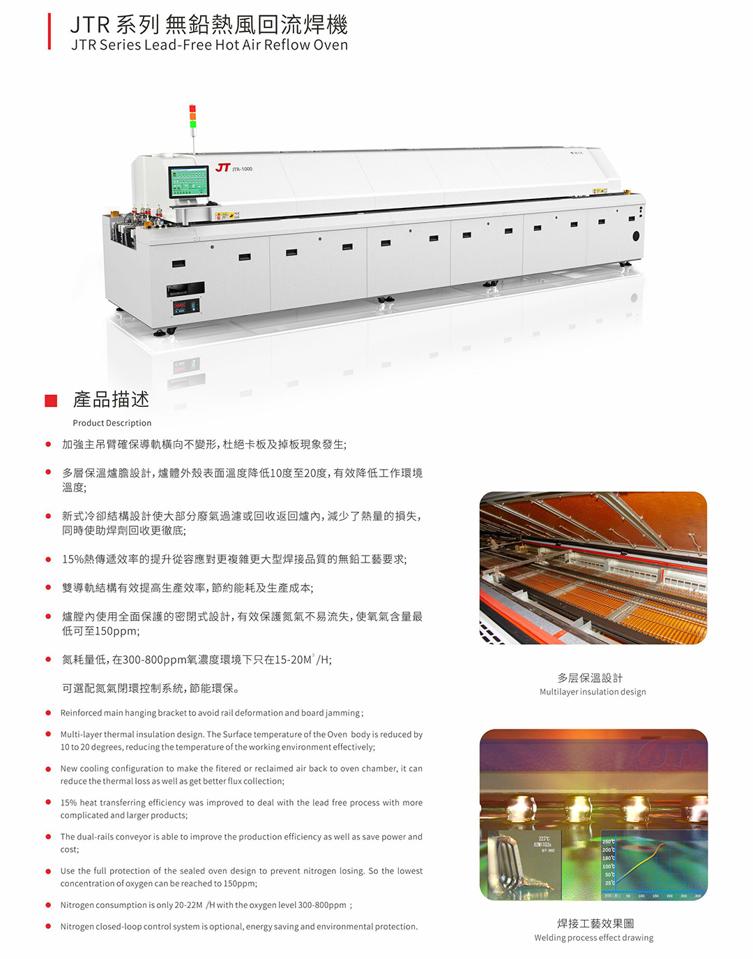 多層保溫爐膛設(shè)計,爐體外殼表面溫度降低10度至20度,有效降低工作環(huán)境溫度。15%熱傳遞效率的提升從容應(yīng)對更復(fù)雜更大型焊接產(chǎn)品的無鉛工藝要求。加強主吊臂確保導(dǎo)軌無橫向變形,杜絕卡板及掉板現(xiàn)象發(fā)生。爐膛內(nèi)使用全面保護的密閉式設(shè)計,有效保護氮氣不易流失,使氧氣含量可低至150ppm。氮耗量低,在300-800ppm氧濃度環(huán)境下…